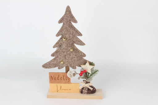 Mae'r addurniadau wedi’u gwneud o ffelt a phren.